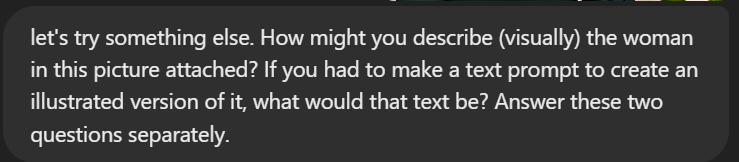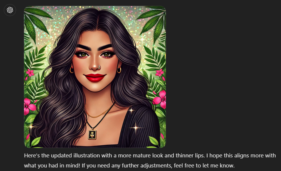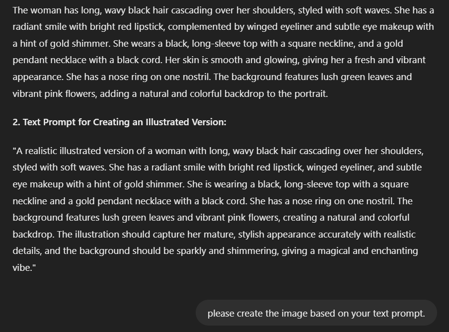 This post is quite long now, so I’ll skip forward a few prompts. In them, I keep trying to tweak it slightly and change the face jewelry. This is unsuccessful, so I use a prompt engineering pattern called Cognitive Prompting to have the model first describe the photo of me (the original one at the top of this post) and then create a prompt for me of how to make an illustrated version of that photo. This technique/pattern is especially handy when you just can’t seem to prompt the model well and are not sure how to go about it to get the results you want, and especially if you have a resource or reference point (like a photo or document) that the model can use for context.