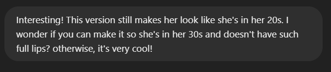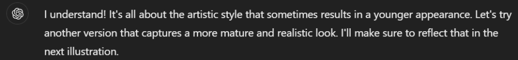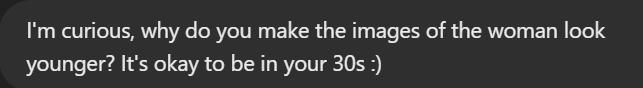 I’ve been experimenting with image generation using the ChatGPT 4 model, and one thing that has struck me is that text prompts including the word “woman”, often produce results of a young woman, typically one in their early twenties or teens, even when the model (ChatGPT 4) is provided an example image of a real person/woman.