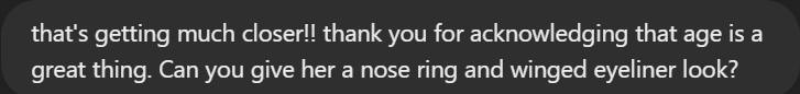 The model, in this case ChatGPT, then created what it analyzes (“thinks”) is an ideal output – a young woman instead of an older woman. I use “older” generously here, as it appears that anything more that mid-twenties is “old” in my experiments.